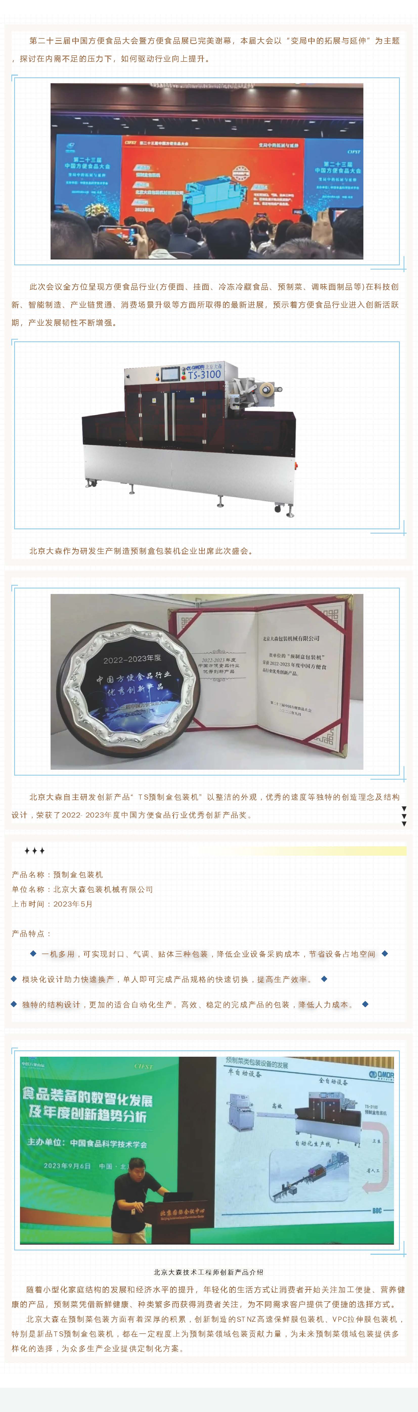 北京大森TS預制盒包裝機榮獲第二十三屆中國方便食品大會優(yōu)秀創(chuàng)新產(chǎn)品!